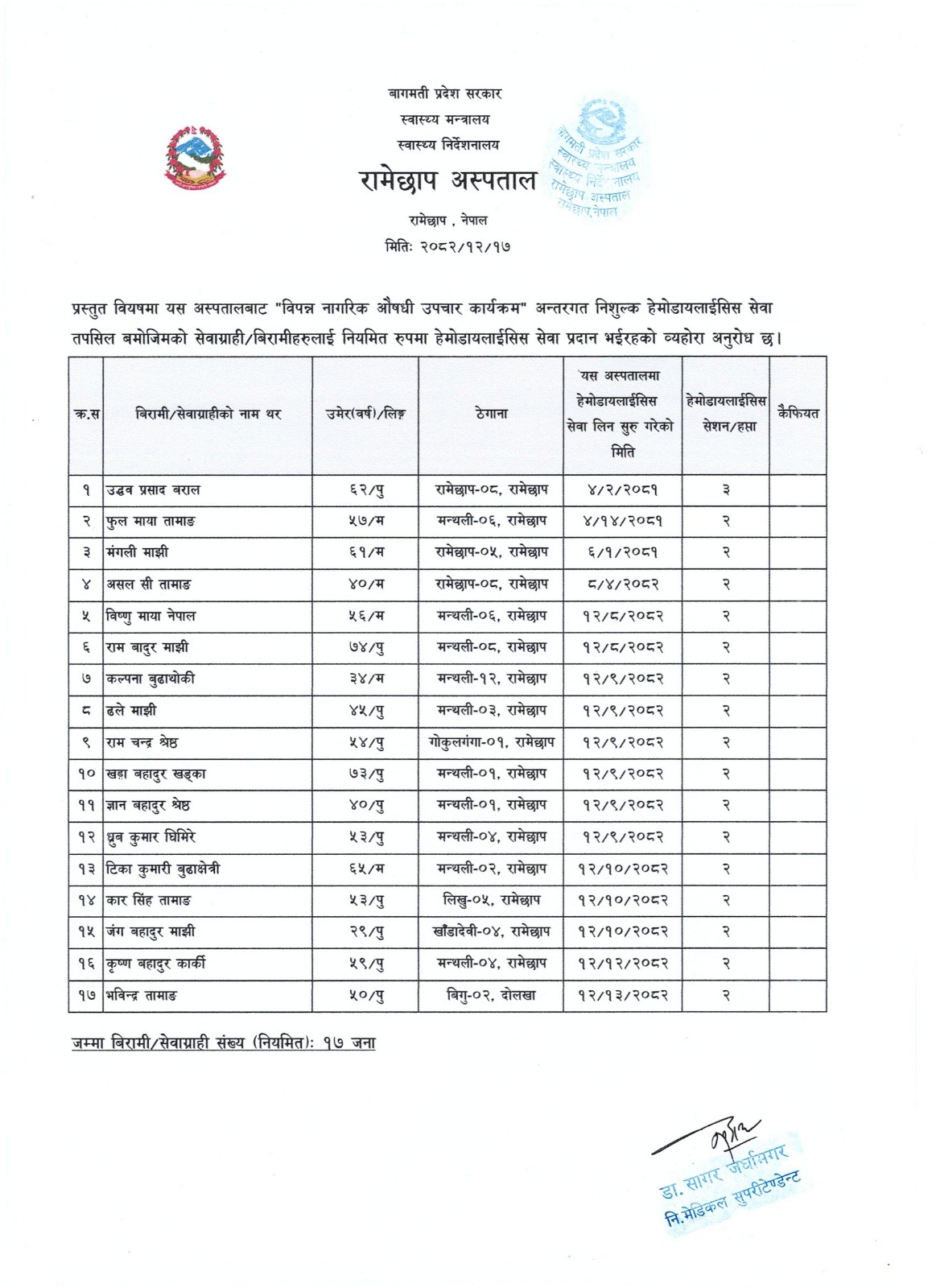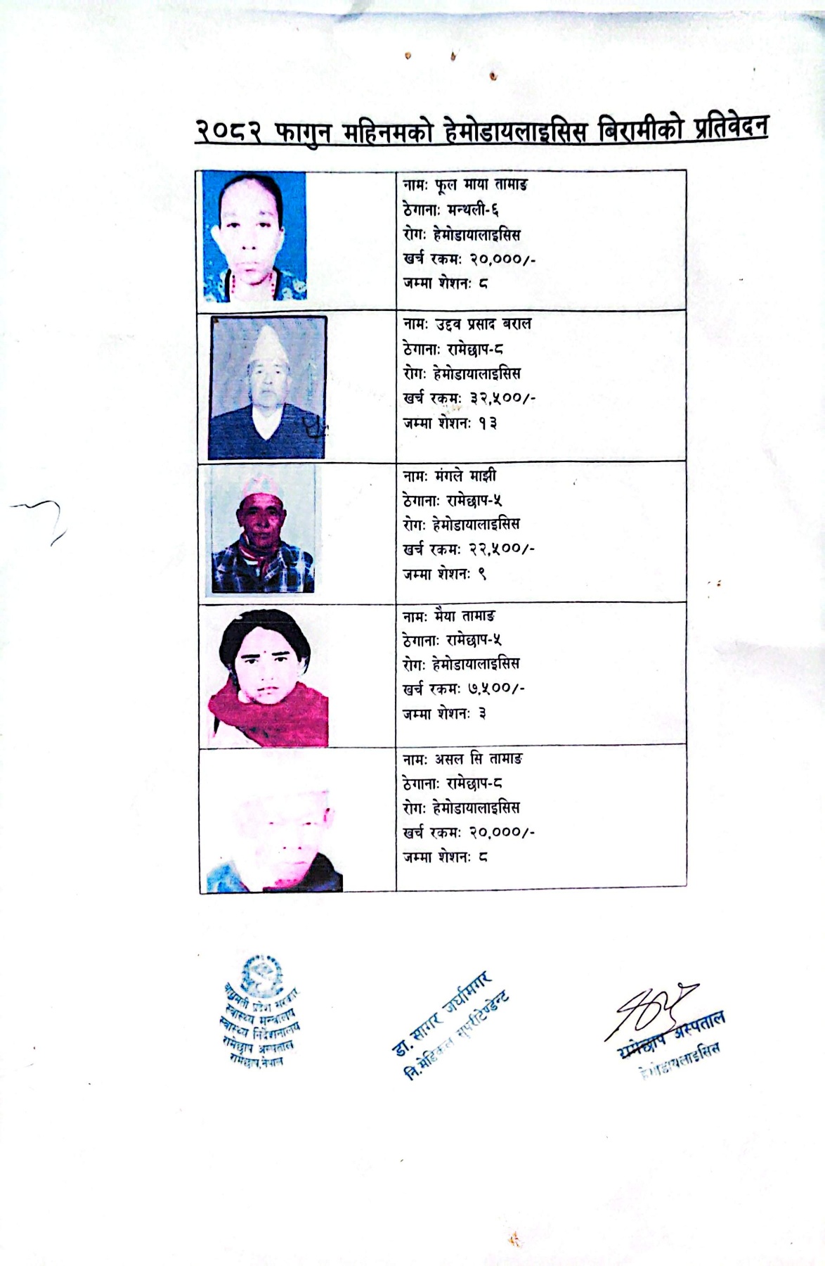 रामेछाप अस्पतालबाट मिति २०८२ साल फागुन महिनाको हेमोडायलाइसिस सेवा लिने बिरामीको मासिक प्रतिबेदन |