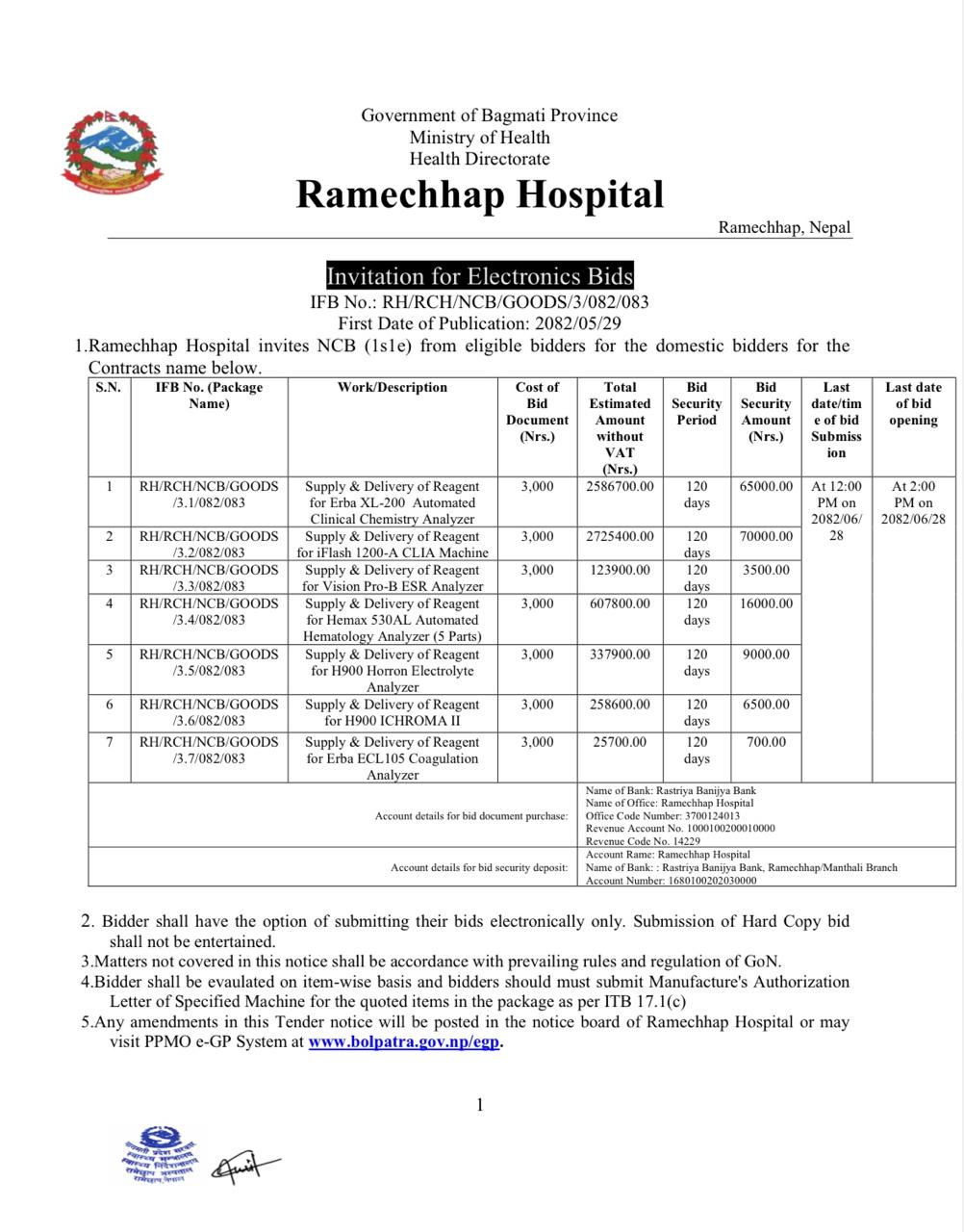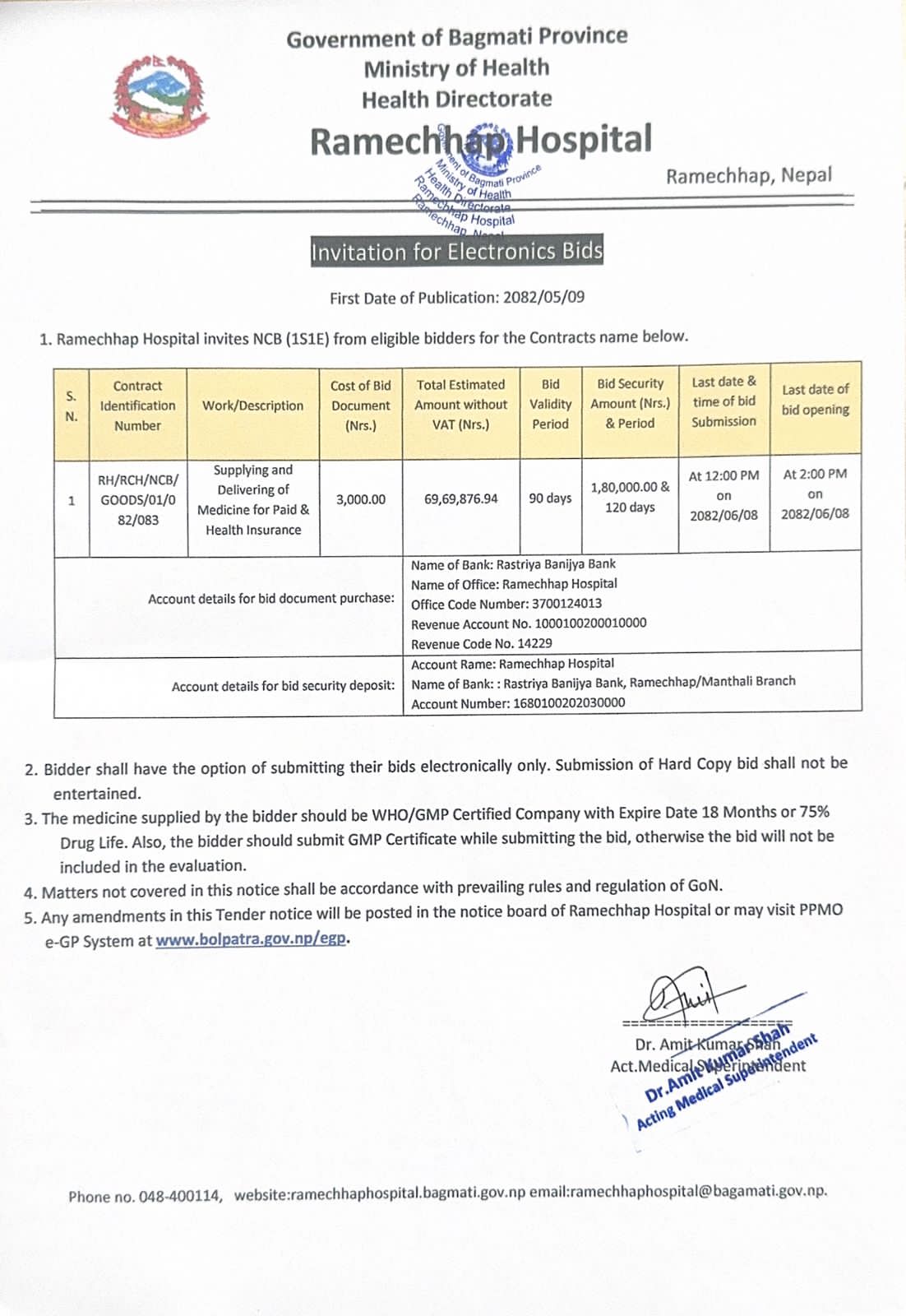 इलेक्ट्रोनिक बोलपत्रको सम्बन्धि सूचना प्रथम प्रकाशन मिति: २०८२/०५/०९ रामेछाप अस्पतालले निम्न विवरण अनुसारको करार कार्यका लागि योग्य बोलदाता कम्पनी/फर्महरूलाई इलेक्ट्रोनिक बोलपत्र (e-Bid) पेश गर्न आह्वान गर्दछः |